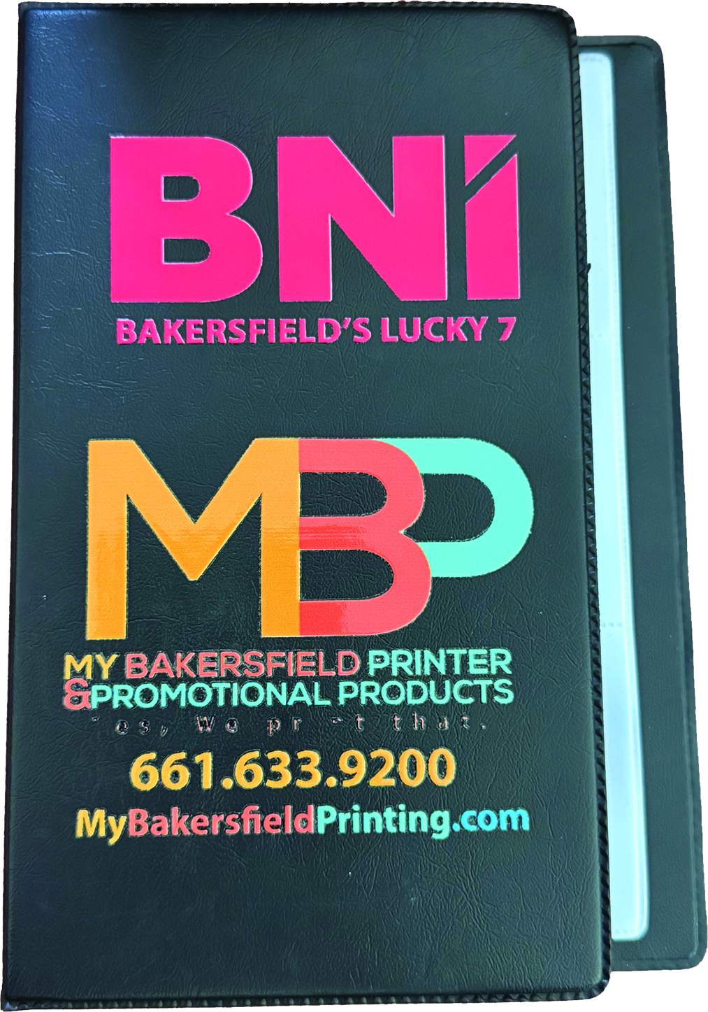 Each organizer features a custom front decal displaying the BNI chapter logo along with your personal logo and business information, printed in a clear and vibrant design.